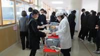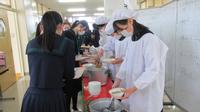 例年給食週間では、給食委員会主催の朝礼を実施してお礼の色紙を渡していました。朝礼が出来ない時は、生徒委員会の時間に給食委員全員で給食室を訪ねて色紙を渡していましたが、今年度は感染急拡大により接触は最小限にとどめた方が良いと判断し、ワゴン受け渡しの時に、給食室チーフとパートさんに給食委員2年代表が色紙を渡す形となりました。